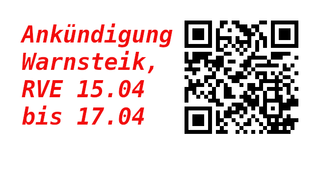 Ankündigung Warnstreik 14. April 2026 von Redakteur Ankündigung Warnstreik vom 15. – 17. April 2026 Folgende Pressemeldung wurde an uns vom RVE übermittelt: Weiterlesen
